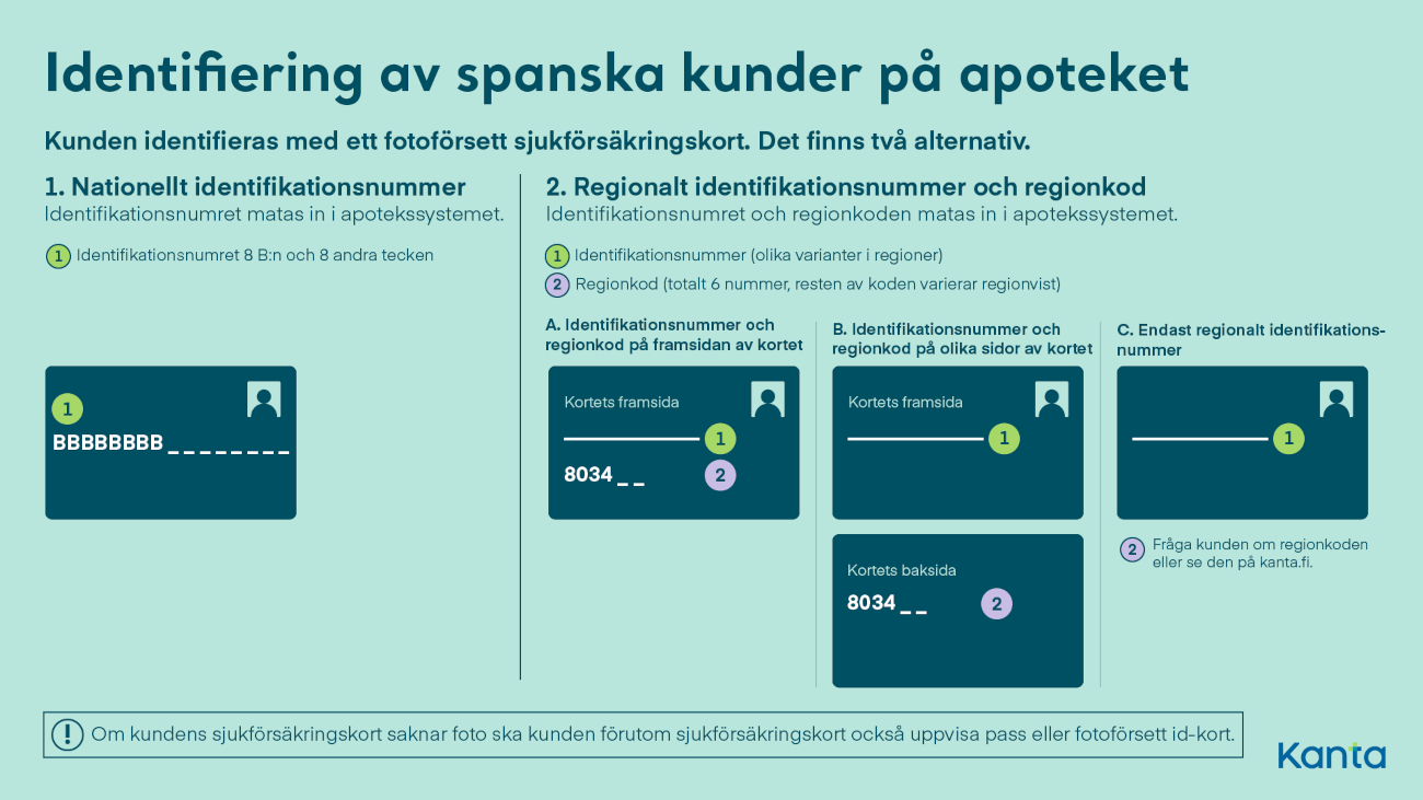 - Kunden identifieras med ett fotoförsett sjukförsäkringskort (sp tarjeta sanitaria, förkortning TASA). Om kundens spanska sjukförsäkringskort inte är försett med foto, ska hen dessutom visa upp pass eller fotoförsett identitetsbevis.